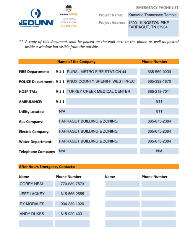 Emergency Information:Inform JE Dunn team immediately in the event of an emergency or if a 911 call is placed. Knoxville Temple Emergency Contact Information